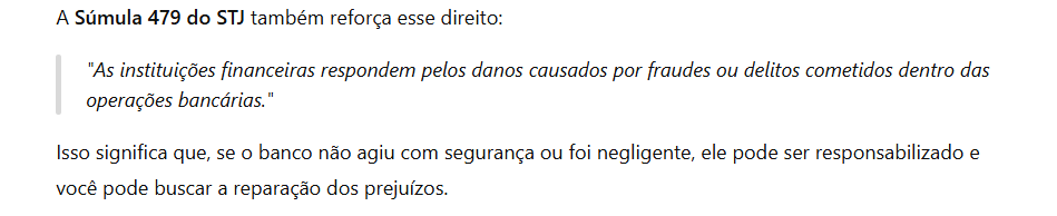 Isso significa que se o seu banco não agiu com a segurança devida, ele pode ser responsabilizado e você tem o direito de buscar a reparação do prejuízo.